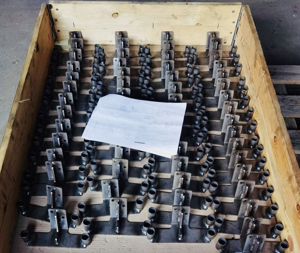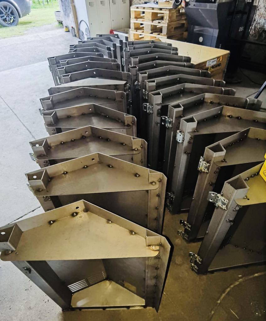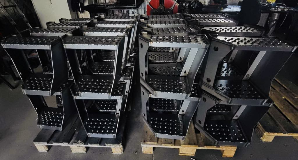 Wykonujemy gięcia za pomocą pras krawędziowych. Prasy do których mamy dostęp, posiadają nacisk w wysokości 100 ton.